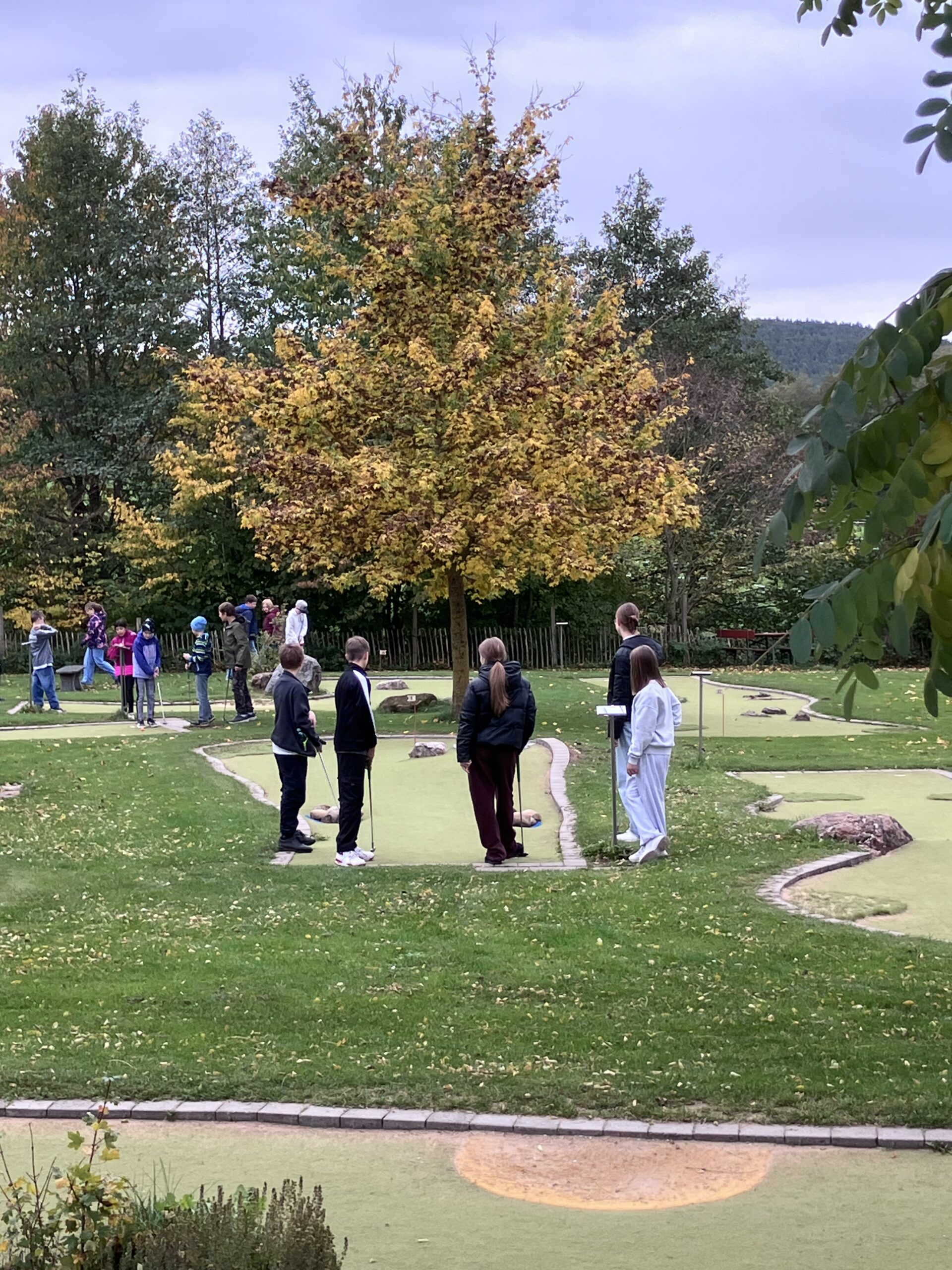 Auf dem Programm standen außerdem zwei kleine Wanderungen durch die herbstliche Umgebung. Die Schülerinnen und Schüler genossen die frische Luft, das gemeinsame Laufen und die Gespräche unterwegs. Natürlich musste sich zwischendurch auch immer wieder beschwert werden, da Wandern ja allgemein so anstrengend sei. Ein besonderes Highlight war der Besuch der Minigolfanlage direkt neben einem Känguru-Gehege – dort wurde mit viel Spaß und Gelächter um die besten Schläge gespielt. Der erste Abend stand ganz im Zeichen der Gemeinschaft: Beim Spieleabend wurde in kleinen Gruppen gespielt, gelacht und gerätselt.