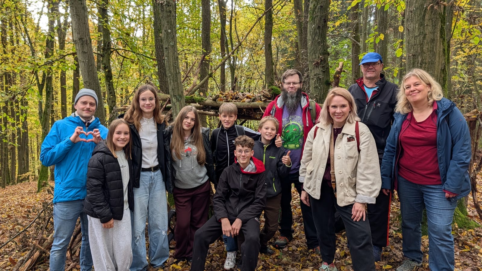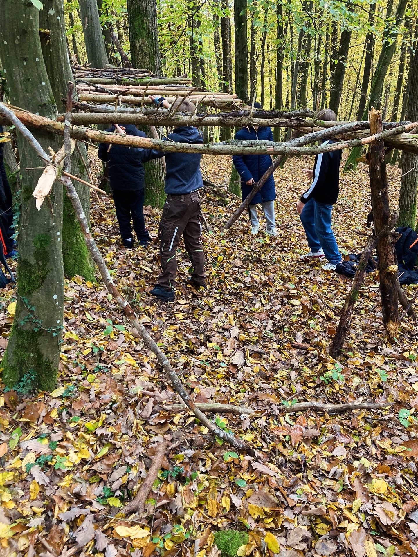 Der zweite Tag begann dann mit einer weiteren Wanderung – zum Glück für manche etwas kürzer – in einen herbstbunten Wald, auf dessen weichem Boden zahlreiche Gegenstände lagen, mit denen unsere Fünftis sogenannte Nature Art gestalteten. Unser Tutoren-Team baute sogar ein stolzes Haus aus Ästen und Gestrüpp, das sich kaum vor der Burg Wernfels verstecken musste.